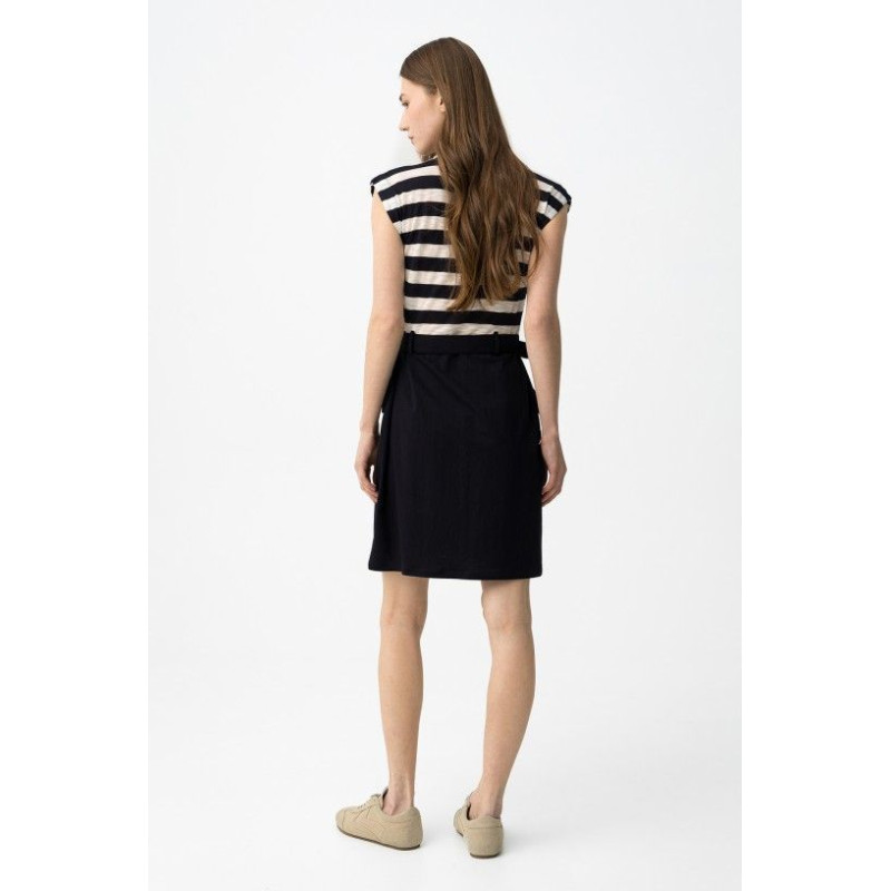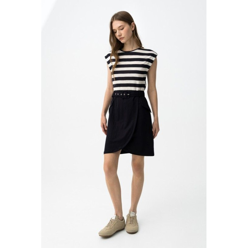 Vestido slim, parte superior a rayas blancas y negras, falda negra con cinturón y corte moderno.