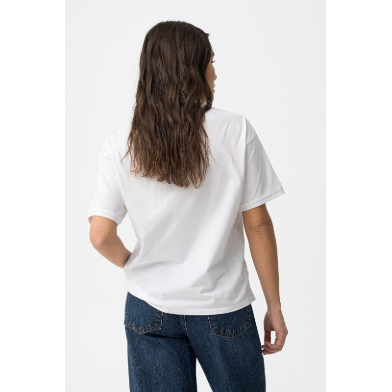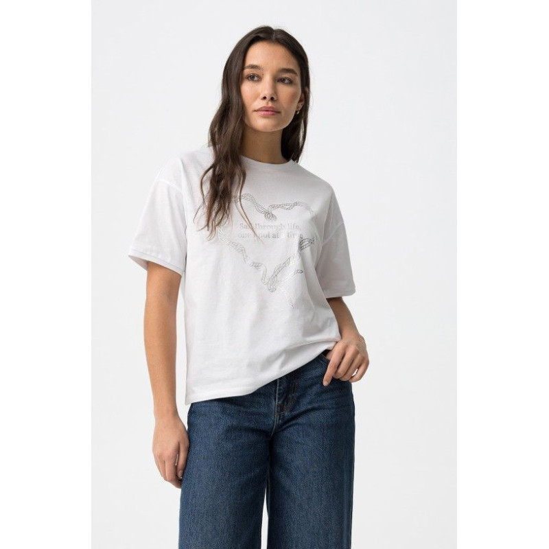 Camiseta de manga corta, corte relaxed, de color blanco, con dibujo de cuerdas y mensaje frontal.