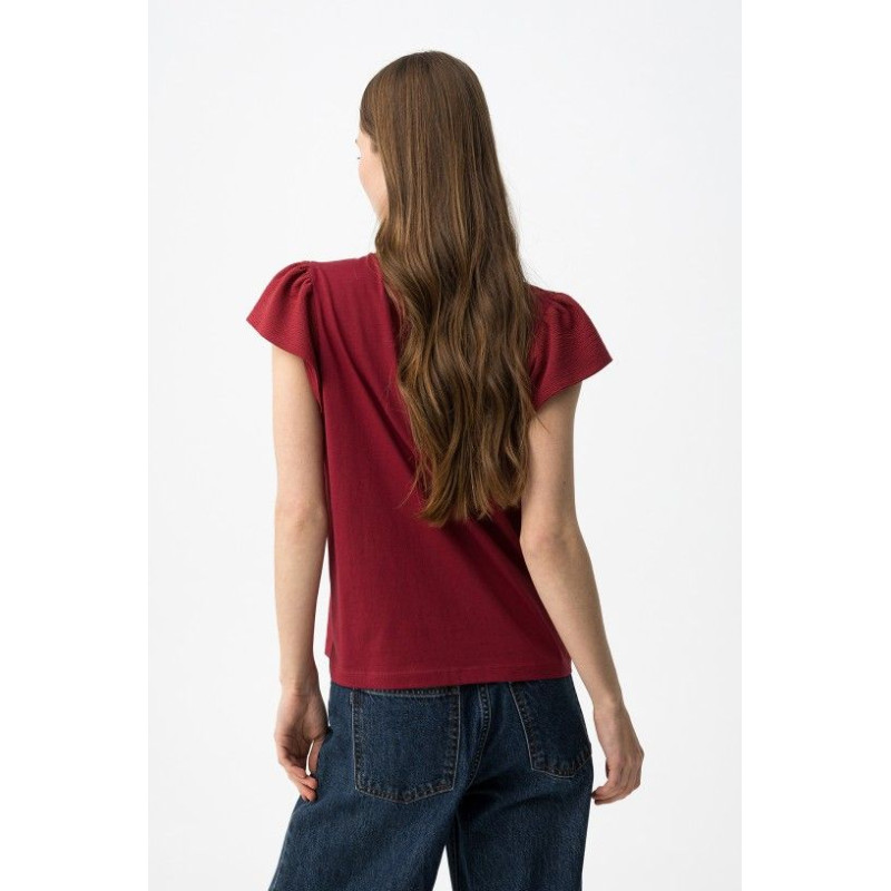 Camiseta de corte regular en rojo intenso, con mangas cortas y detalle de frunces en los hombros.