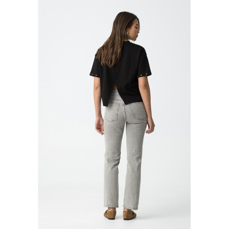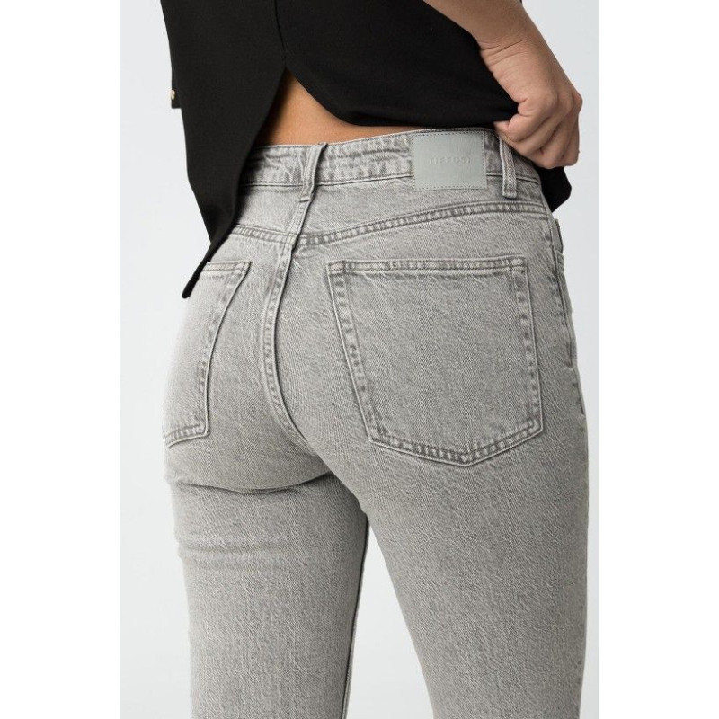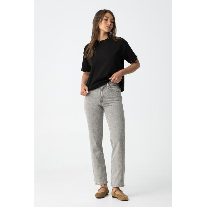 Vaqueros de cintura alta en gris claro, corte recto y cinco bolsillos. Cierre con cremallera y botón metálico.